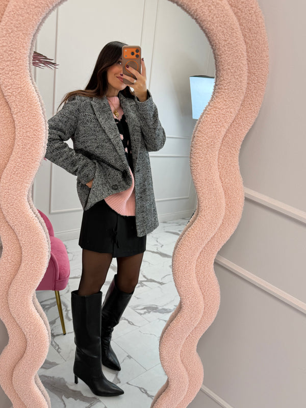 Stivale, con gambale ampio e morbido, altezza sotto il ginocchio, punta appuntita e affusolata, tacco cm 6,5, ecopelle, interno rivestito, calzata regolare.