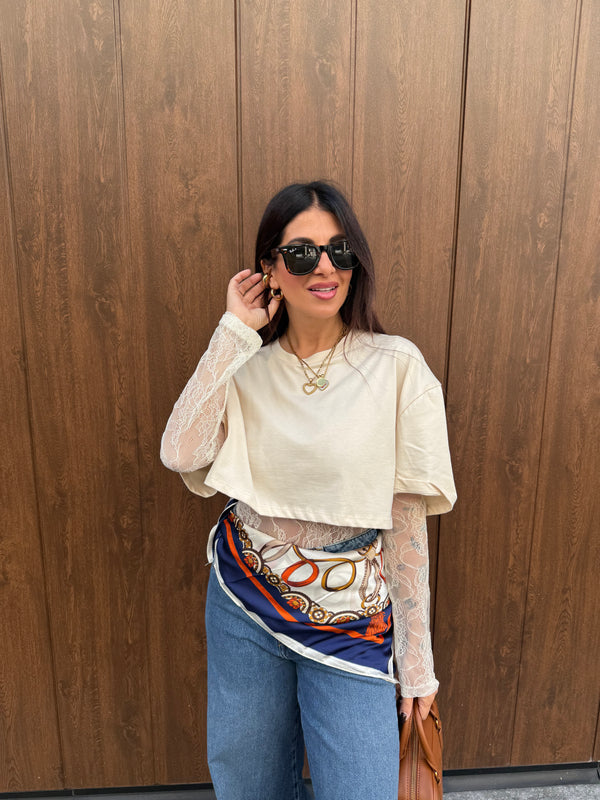 T-shirt, girocollo, modello crop a scatolina, con body e maniche in pizzo incorporati. Vestibilità regolare, la modella è alta 160cm e indossa la taglia S.