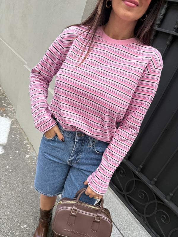 T-shirt a manica lunga, girocollo, in fantasia rigata, vestibilità regolare. La modella è alta 160cm e indossa la taglia XS.