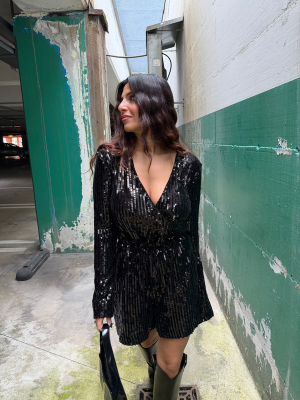 Tutina shorts, manica lunga, scollo a V, elastico in vita, vestibilità regolare, interno foderato. La modella è alta 160cm e indossa taglia XS.